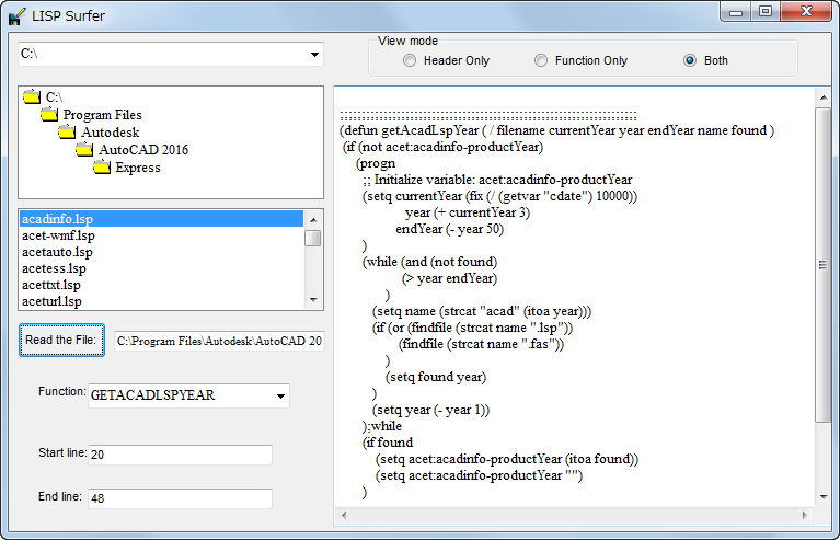 AutoLISP ファイルのコンテンツが個々の関数別に表示されます。