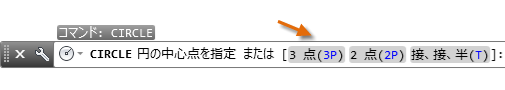 他のオプションは、コマンド ウィンドウに CIRCLE または C と入力し、オプションをクリックして選択できます。このようにすると、次に示すように、中心点を指定するか、ハイライト表示されているコマンド オプションの 1 つをクリックすることができます。