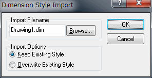 | [Import Options] | 現在の図面内の寸法スタイルを保持する[Keep the Existing Style]と、現在の図面内のスタイルを上書きする[Overwrite Existing Style]があります。[Keep the Existing Style]オプションは、読み込まれた同じ名前のスタイルを無視し、[Overwrite Existing Style]は読み込まれた同じ名前のスタイルを使用します。 |