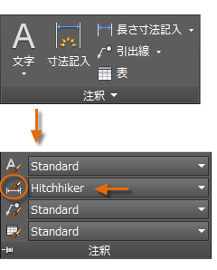 現在の寸法スタイルの名前(この例では Hitchhiker)は、[注釈]パネルのドロップダウン リストに表示されます。