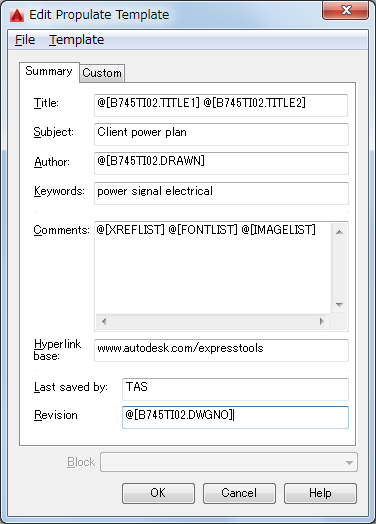 PROPULATE のテンプレートを編集するPROPULATE では、テンプレート ファイルを使用して、図面の図面のプロパティ フィールドに挿入する値を決定します。テンプレート ファイルは、編集して図面のプロパティ ダイアログ ボックスのどのフィールドにどのような値を適用するかを指定してから、使用する必要があります。異なるテンプレート ファイルを必要なだけいくつでも作成できますが、一度にアクティブにできるのは 1 つだけです。既定のテンプレート ファイルの名前は template.prpです。既存のテンプレートを編集する、または新しいテンプレートを作成するときは、[Edit Propulate Template]ダイアログ ボックスを使用する方法が最も簡単です。