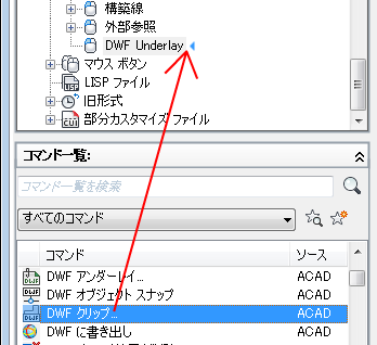 - ダブルクリック アクションに追加するコマンドを、[コマンド一覧]ペインから[ <ファイル名> 内のカスタマイズ]ペインにドラッグします。