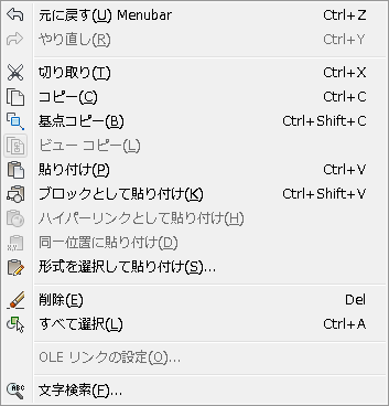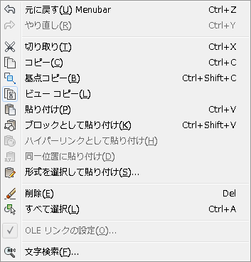 次の例では、[編集]メニューの[OLE リンクの設定]メニュー項目にはチェック マークが付けられ、[ビュー コピー]メニュー項目のイメージは外枠で囲まれて強調表示されています。