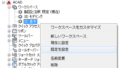 CUIx ファイル内のワークスペースを既定としてマークすることができます。ワークスペースを既定として設定すると、CUIx ファイルが最初にプログラムにロードされたとき、または CUIx ファイルが CUILOAD[CUI ロード]コマンドを使用してロードされた後、このワークスペースが呼び出されると決定されます。