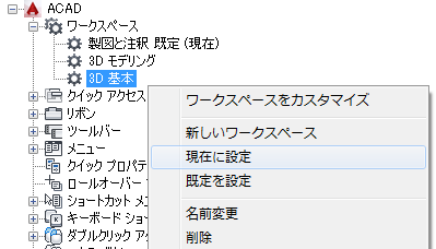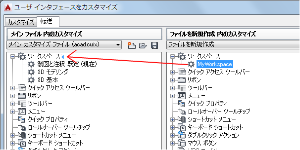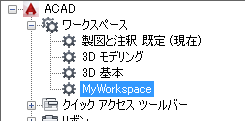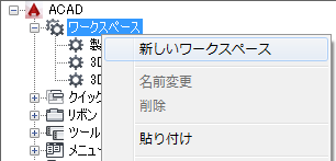 ワークスペースを現在に設定したり、ワークスペースを作成または修正したり、部分 CUIx ファイルからメイン CUIX ファイルにワークスペースを読み込むことができます。