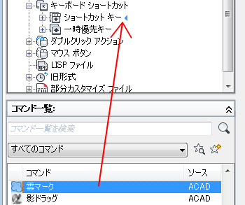- ショートカット キーを作成するには、[コマンド一覧]ペインから、コマンドを[ <ファイル名> 内のカスタマイズ]の[ショートカット キー]ノードにドラッグします。
