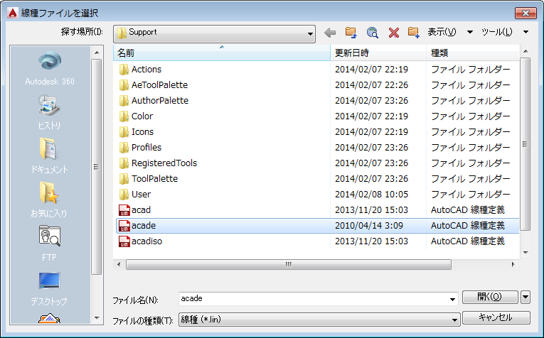 - [線種ファイルを選択]ダイアログ ボックスで acade.lin を選択して[開く]をクリックします。