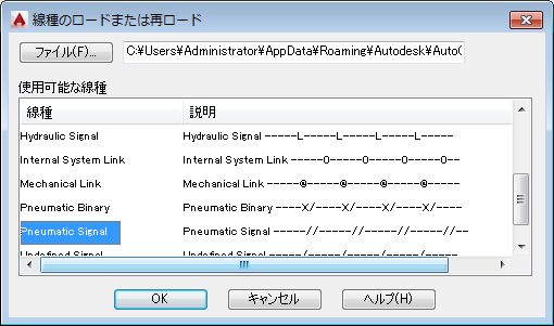 - [線種ファイルを選択]ダイアログ ボックスで[Pneumatic Signal]を選択して[OK]をクリックします。