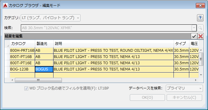 AutoCAD Electrical には、サンプルのカタログ情報が用意されています。カタログ情報は、Access データベース ファイル(.mdb)のテーブルに保持され、サンプルのベンダー データが入力されています。