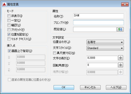 - コマンド プロンプトで ATTDEF と入力して、属性定義オブジェクトを挿入します。