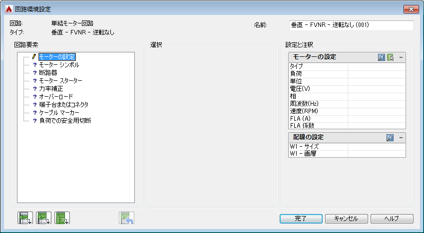 [モーターの設定]領域に値が入力されます。既定の配線サイズがモーターの負荷に基づいて選択され、[配線の設定]領域に表示されます。