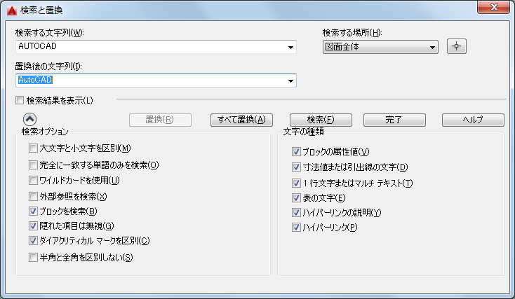 [検索する場所]リストから選択した項目によって、図面全体または現在選択しているオブジェクト内の文字列が検索されて置き換わります。