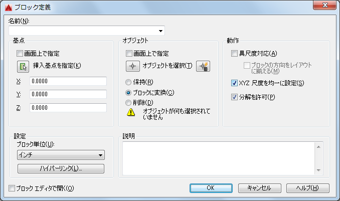 ブロックを作成した後に、図面上で選択したオブジェクトをブロック インスタンスに変換します。