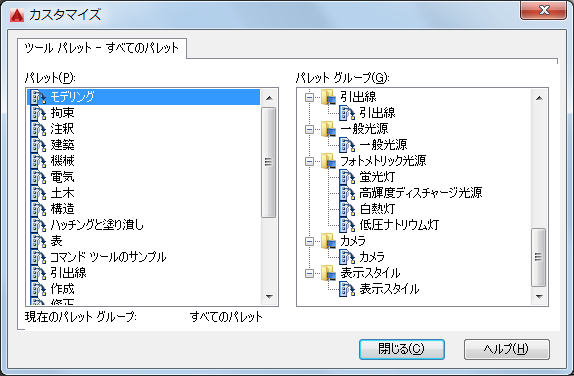 ツール パレット グループとそれぞれに含まれるツール パレットが表示されます。