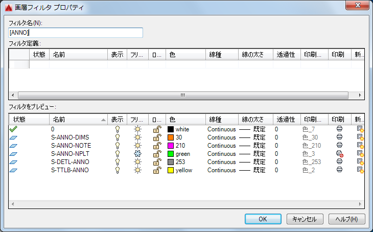 「Anno」という名前のフィルタでは、次の条件の 1 つに一致する画層が表示されます。