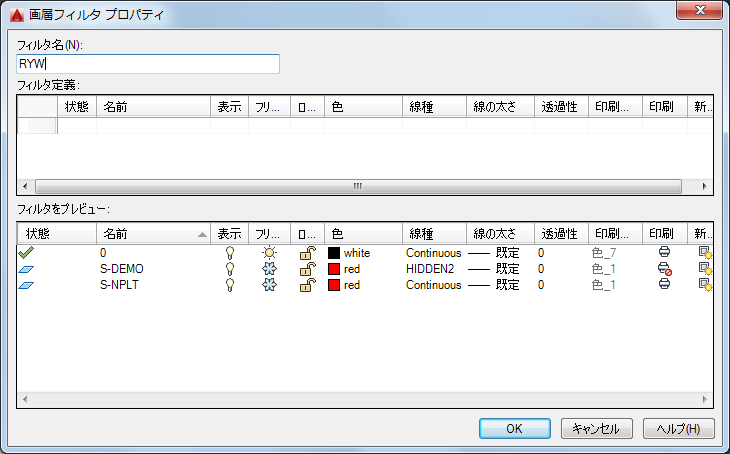 画層フィルタには、プロパティの設定に基づいたものと、指定した画層名をグループ化したものの 2 つのタイプがあります。