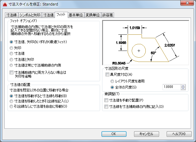 寸法値、矢印、引出線、寸法線の配置をコントロールします。