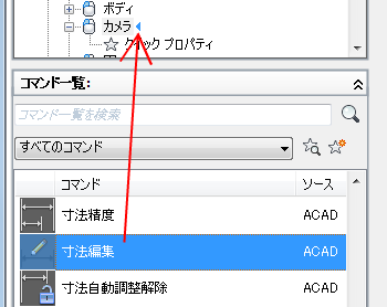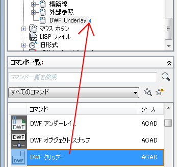 - ダブルクリック アクションに追加するコマンドを、[コマンド一覧]ペインから[ <ファイル名> 内のカスタマイズ]ペインにドラッグします。