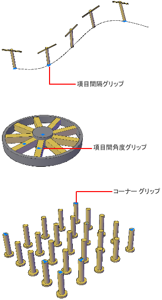 表示されるグリップの種類とダイナミック メニュー オプションは、配列複写のタイプによって異なります。