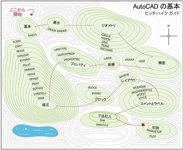 『AutoCAD の基本ヒッチハイク ガイド』にようこそ。このガイドでは、AutoCAD または AutoCAD LT を使用して 2D 図面を作成するために必要な 42 個の基本的コマンドについて説明しています。