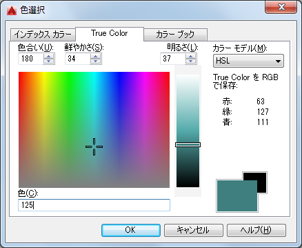 RGB カラー モデルを使用して、色を選択します。[True Color]タブで使用できるオプションは、HSL と RGB のどちらのカラー モデルを指定するかによって異なります。