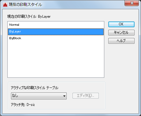 現在の図面にアタッチされている印刷スタイル テーブルが表示されます。印刷スタイル テーブルには印刷スタイルの定義が含まれます。