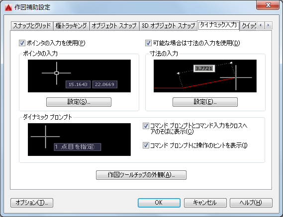 ポインタ入力、寸法入力、ダイナミック プロンプト、および作図ツールチップの外観をコントロールします。