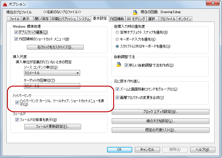 [オプション]ダイアログ ボックスの[基本設定]タブで、ハイパーリンク情報の表示を有効にします。