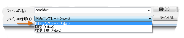 既存の図面テンプレート ファイルを修正するには、[開く]をクリックし、[ファイルを選択]ダイアログ ボックスで[図面テンプレート(*.dwt)]を選択し、テンプレート ファイルを選択します。