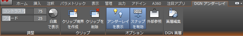 図面内の DGN アンダーレイを選択すると、[DGN アンダーレイ]コンテキスト タブがリボンに表示されます。