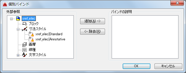 外部参照リストで選択した名前の付いたオブジェクトの定義を[バインドの説明]リストに移動します。