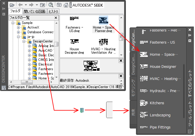 - DesignCenter から図面、ブロック、ハッチングをドラッグします。ツール パレットに追加した図面は、図面にドラッグしたときにブロックとして挿入されます。
