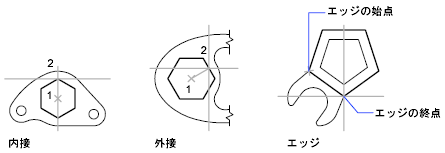 次の図は、3 つの方法( [内接(I)]、[外接(C)]、[エッジ(E)])を使用して描いたポリゴンを示しています。いずれの場合も、2 つの点を指定しています。