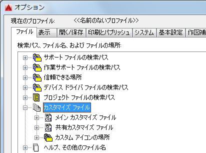 - [オプション]ダイアログ ボックスの[ファイル]タブで、[カスタマイズ ファイル]ノードの横のプラス(+)記号をクリックして展開します。