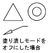 塗り潰しモードをオフにします。オブジェクトの外形線だけが表示され印刷されます。塗り潰しモードを変更しても、図面を再作図するまでは、既存のオブジェクトには影響しません。線の太さの表示は、塗り潰しモードの設定による影響は受けません。