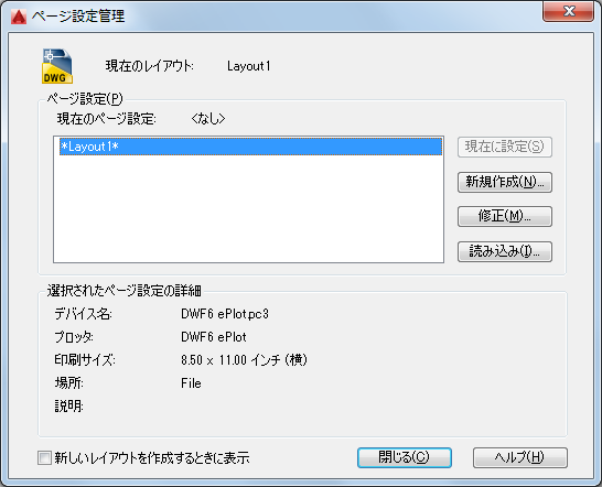 現在のページ設定が表示されます。別のページ設定を現在のページ設定にしたり、新しいページ設定を作成したり、既存のページ設定を修正したり、他の図面からページ設定を読み込みます。