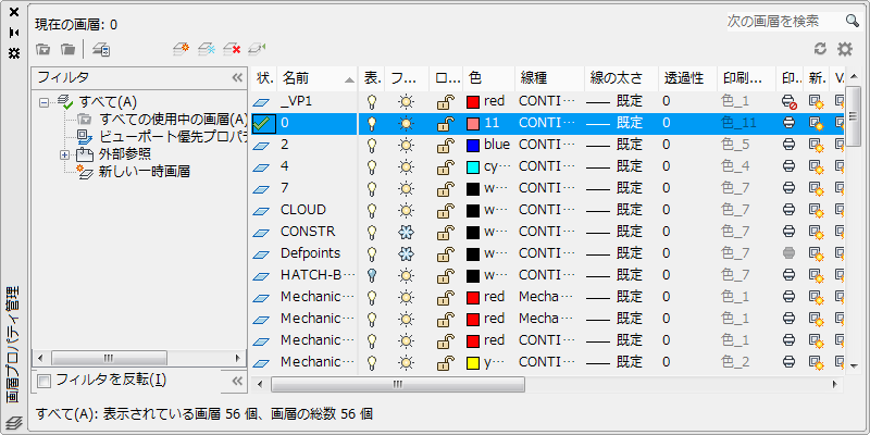 新しい画層の追加、既存の画層の削除、画層名の変更、画層プロパティの変更のほか、レイアウト ビューポートでプロパティの優先を設定することや、画層の説明を追加することができます。[画層プロパティ管理]には、[フィルタ]パネルと画層リスト パネルがあります。画層フィルタは、画層リストに表示される画層をコントロールします。画層フィルタを使用して、一度に複数の画層を変更することもできます。