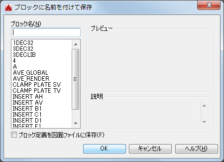 ブロック定義を図面ファイルとして保存します。既存の図面ファイルを選択すると、保存するファイルで上書きされます。既定では、図面ファイル名がブロック名として指定されます。
