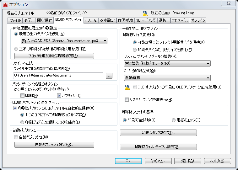 新規図面や、AutoCAD Release 14 以前のリリースで作成され AutoCAD 2000 以降の形式ではまだ保存されていない図面の既定の印刷設定をコントロールします。