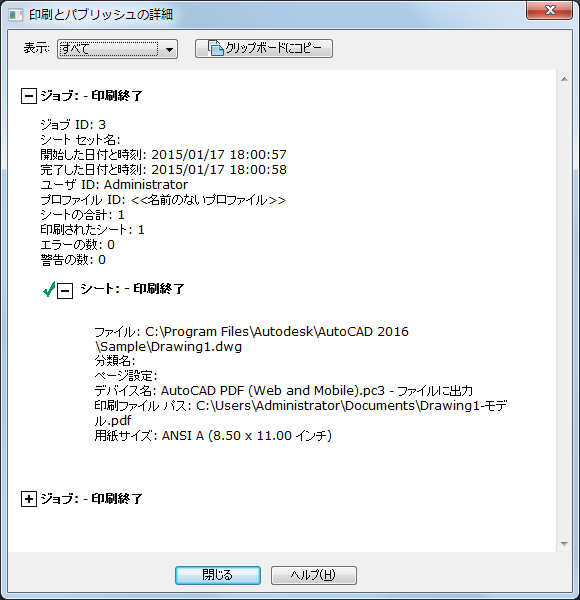 すべての完了した印刷とパブリッシュのジョブおよびこれらのジョブのシートに関する情報が表示されます。
