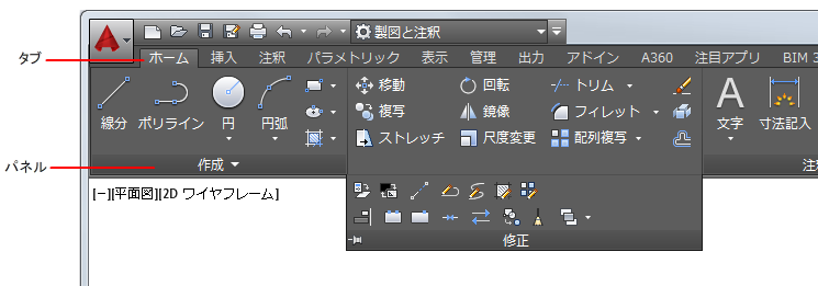 リボン タブからパネルを引き離し、作図領域や他のモニタに置くことができます。浮動パネルは、リボン タブを切り替えても、リボンに戻さない限り開いたままになります。