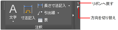 リボンは、図面の作成や修正に必要なすべてのツールのコンパクトなパレットを提供します。次のいずれかの位置に配置できます。