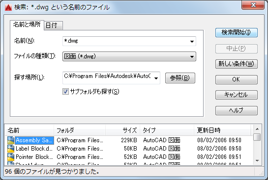 検索対象のファイルの種類は[タイプ]リスト ボックスで指定しますから、[名前]ボックスにはファイルの拡張子を入力する必要はありません。たとえば、house102.dwg というファイルを検索するには、[名前]ボックスに house* と入力し、[タイプ]リスト ボックスから[図面(*.dwg)]を選択します。