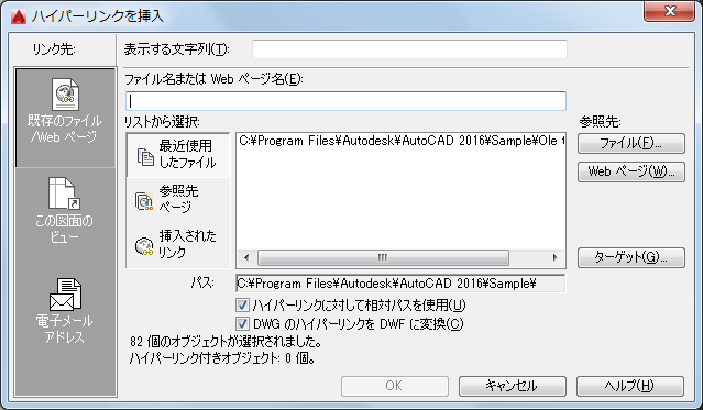 ハイパーリンクに関連付けたファイルへのパスが表示されます。[ハイパーリンクに対して相対パスを使用]チェック ボックスをオンにしているときは、ファイル名だけが表示されます。このチェック ボックスをオフにしているときは、絶対パスとファイル名が表示されます。