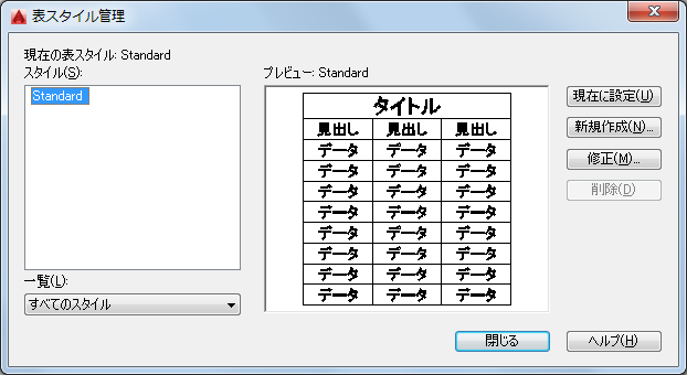 [スタイル]一覧で選択された表スタイルを削除します。図面で使用中のスタイルは削除できません。