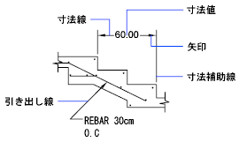 寸法には、寸法値、寸法線、矢印、寸法補助線などのいくつかの要素があります。