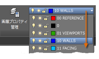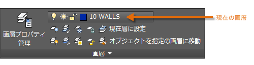 上記では、画層 10 WALLS が 「現在の画層」です。新しく作成したすべてのオブジェクトは、自動的にこの画層に配置されます。画層のリストでの画層 10 WALLS の横の緑のチェックは、それが現在の画層であることを示しています。