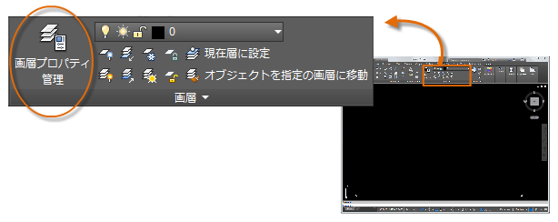 図面の編成方法を確認するには、LAYER[画層管理]コマンドを使用して、[画層プロパティ管理]を開きます。コマンド ウィンドウで LAYER または LA と入力したり、リボンの[画層プロパティ管理]ツールをクリックして表示します。