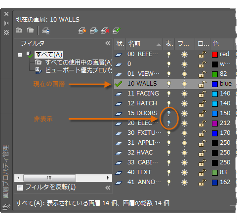 次に示すのは、[画層プロパティ管理]の最も一般的に使用される画層の設定です。設定のオン/オフを切り替えるには、アイコンをクリックします。