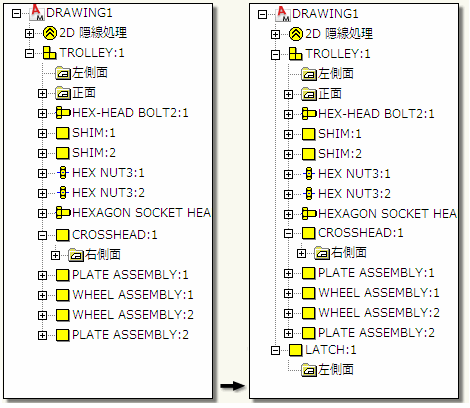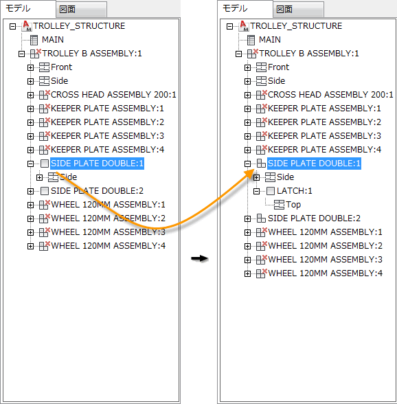 モデル空間にパーツとアセンブリ(コンポーネント)のビューが含まれます。線分、円弧、円(ジオメトリ)をパーツとしてグループ化することは、ジオメトリをパーツ コンポーネントのビューとしてグループ化することを意味します。